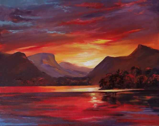 Painted on the shores of Derwentwater, Lake District looking towards the Newlands Valley as the sun goes down.