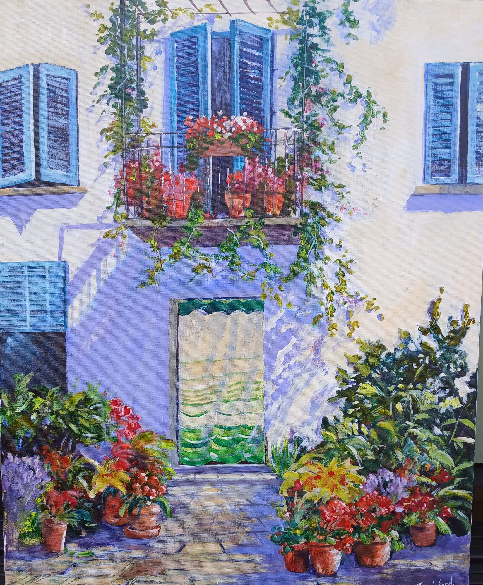Italian Doorway Painted in Acrylics on Canvas Size 20 x 16 inches £250.00  I sat and painted this gorgeous scene one warm Tuesday morning sat in the little square in Iseo Town, Italian Lakes To purchase this original painting or for more information email lakelandart@hotmail.co.uk