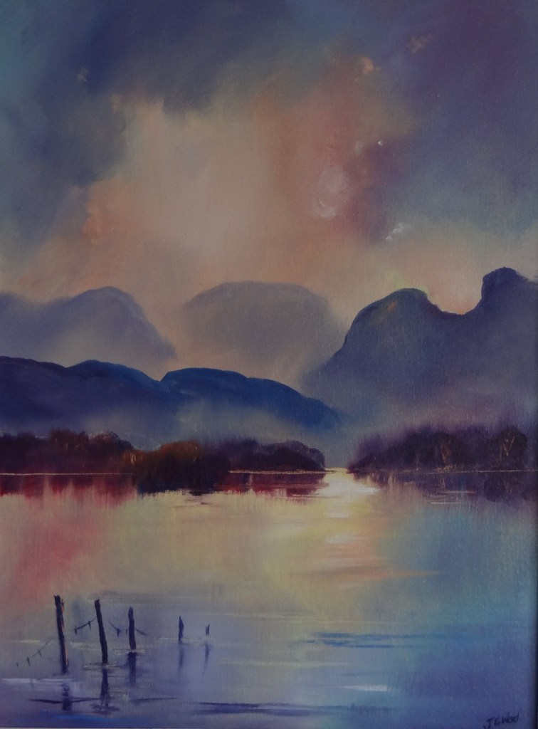 Windermere from Low Wood Bay Soft mystical Lakeland light looking towards the Langdale pikes from the shores at Low Wood, Windermere Painted in Oils Size 14 x 18 inches including Bespoke White Oak box frame £145.00 For more information or to purchase this original piece of art email lakelandart@hotmail.co.uk