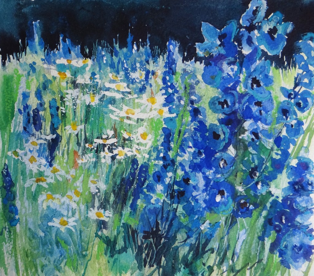 Delphinium Blues Painted in Watercolour Size 9.5 x 8 inches £55 Inspired after a walk through Swinton Estate Walled Garden for more details about this Original watercolour painting email lakelandart@hotmail.co.uk