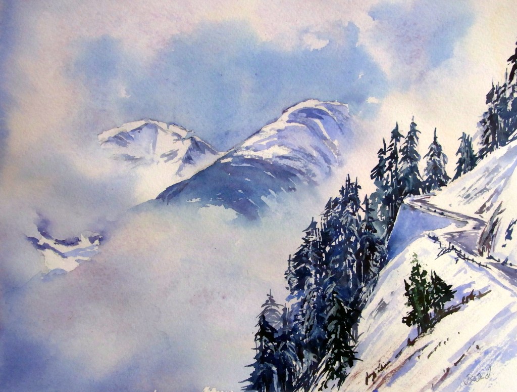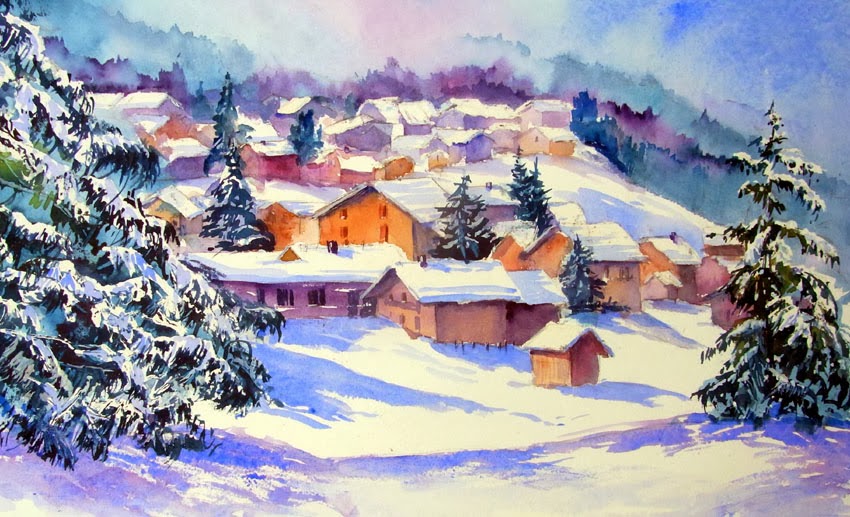 Skiing down on the last run of the day into Les Carroz, inspired this Special watercolour.