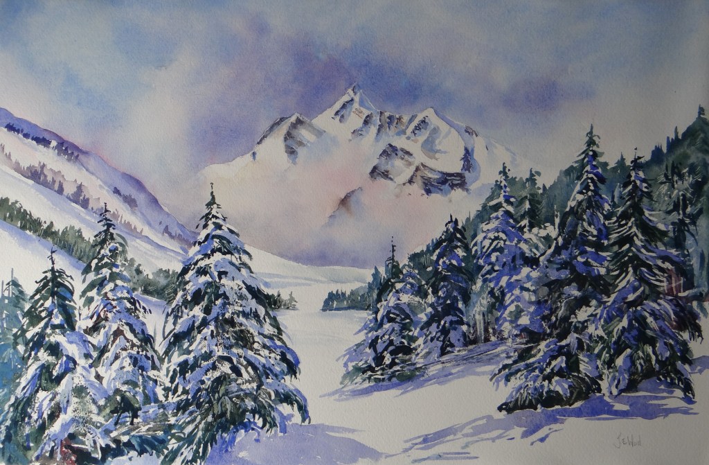 Pointe Percee from Les Carroz, French Alps Painted in Watercolours Size 20 x 13 inches £225.00 This Original Watercolour is sold unframed for safe delivery and personal framing.